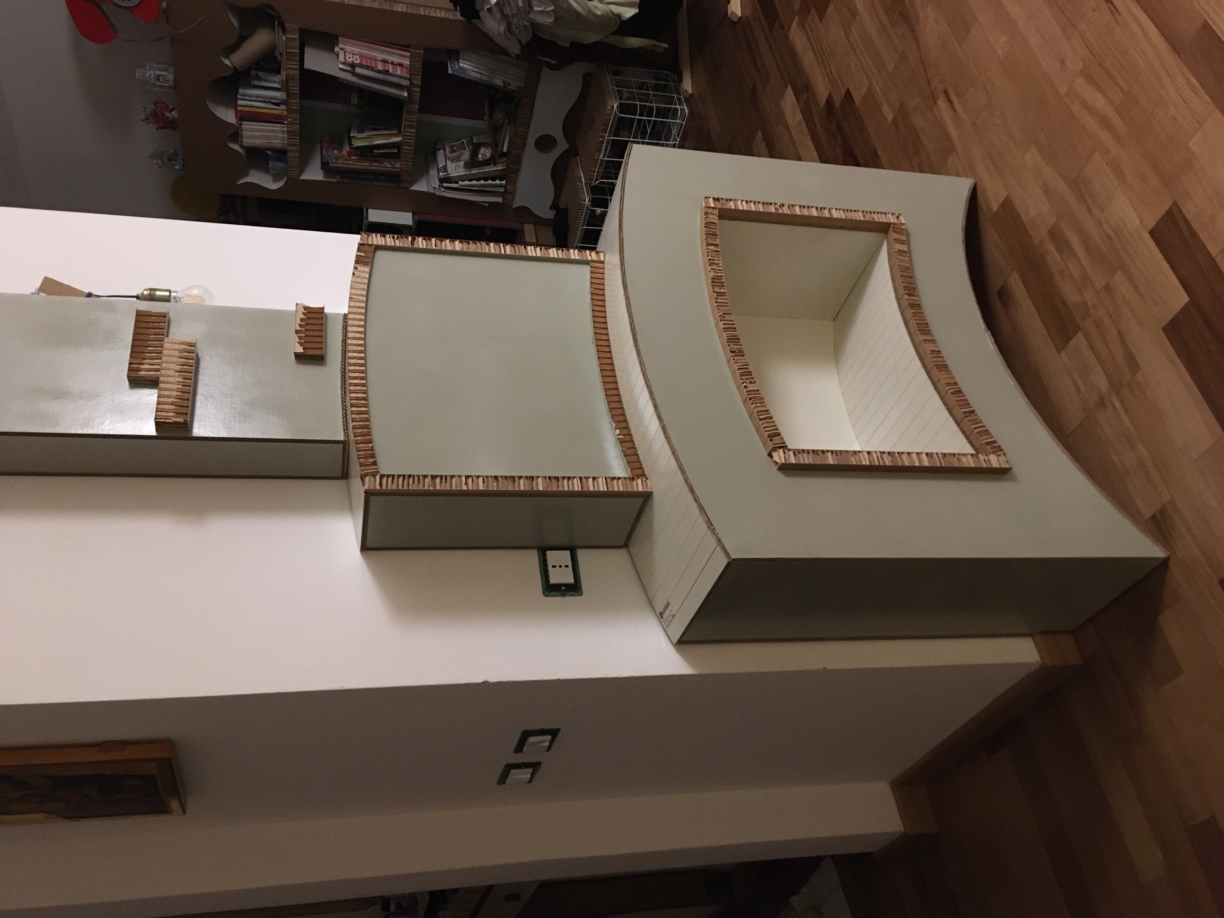 Caminetto stagione invernale 2019/2020, completamente in cartone ondulato verniciato; ideale per rendere “caldo” un angolo di casa in vista dell’inverno. Oggetto personalizzabile in dimensioni e colori. Modello in foto composto da tre moduli separati: larghezza massima 100cm, altezza 300cm, profondità 35cm.